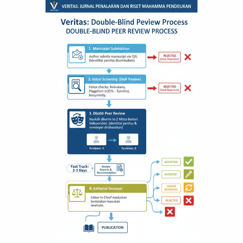 Veritas: Jurnal Penalaran dan Riset Mahasiswa Pendidikan is committed to the highest standards of quality and academic integrity. To ensure objectivity and eliminate bias, the journal employs a strict Double-Blind Peer Review process for all submitted manuscripts.